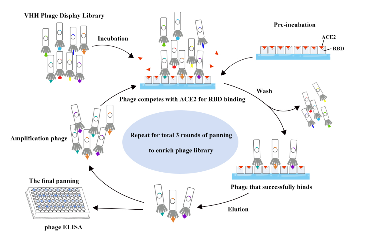 Conventional phage screening is to obtain the antibody binding to the target antigen, express and purify it to verify whether it has biological function, and then verify whether it can block the binding of the receptor and ligand. Usually, in the hundreds or even thousands of antibodies in high-throughput screening, there is a chance to obtain three or two to a dozen antibodies with blocking activity, which is low efficiency and low success rate. In this study, a combination screening strategy was adopted: strict panning and the introduction of non-immobilized ACE2 to compete and guide the panning process. The whole process increased the possibility of screening out phages with high affinity and directly blocking the binding of RBD and ACE2. It will be one of the best choices for in vitro screening of nano-antibodies that can directly block SARS-CoV-2 RBD-ACE2 binding.