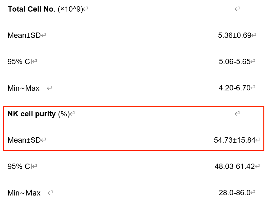 现在深圳豪门国际的NK细胞制备工艺已达到国际同种异体移植标准。NK纯度高于96%(CD56+CD3-),T细胞含量低于1%(CD3+),B细胞含量低于0.1%(CD19+)。2-3周内可制备100亿(1×1010)高纯NK细胞,并检验其对肿瘤细胞杀伤能力,用于临床治疗或临床前科学研究。详细数据见往期推文“研究进展|深圳豪门国际实现CAR-NK制备工艺重大突破”,对NK细胞研究有兴趣者可联系深圳豪门国际市场销售部。
