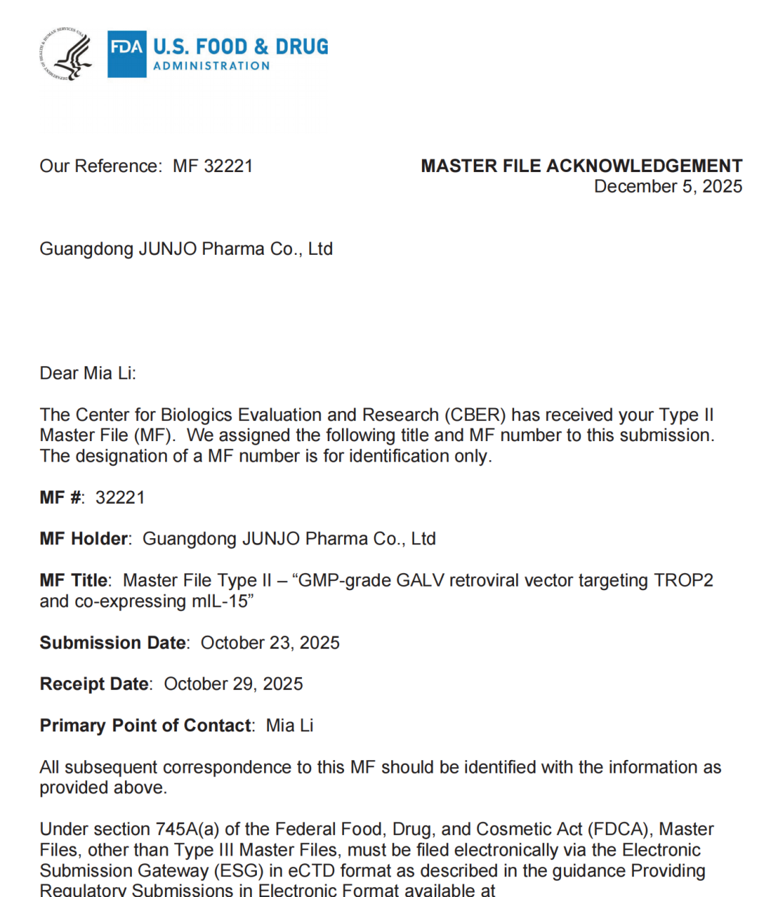 (中国·深圳,2025 年 12 月) ——豪门国际集团全资子公司广东君厚生物医药有限公司(Guangdong JUNJO Pharma Co., Ltd.)正式宣布,其提交至美国食品药品监督管理局(FDA)的GMP 级 GALV 逆转录病毒载体(GALV Retroviral Vector)已取得 FDA 生物制品评审中心(CBER)正式受理并完成备案登记,MF 编号为 MF 32221。该载体同时具备靶向 TROP2 并共表达 mIL-15(TROP2-IL15)的序列。FDA 回执已确认该 DMF 为 Type II Master File