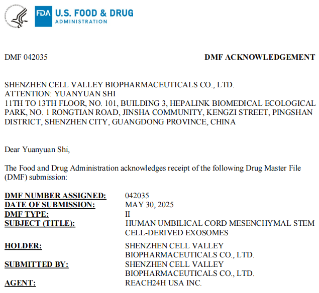 近期,深圳豪门国际主研发的脐带间充质干细胞衍生外泌体(UMBILICAL CORD MESENCHYMAL STEM CELL-DERIVED EXOSOMES)取得重大进展,正式顺利获得美国食品药品监督管理局(FDA)药物主文件(DMF)II型备案(备案号为042035),并在FDA网站上公布。