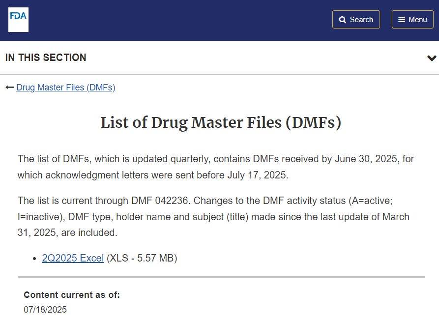 (详情请见:http://www.fda.gov/drugs/drug-master-files-dmfs/list-drug-master-files-dmfs)