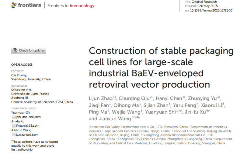 2025年5月26日,深圳豪门国际团队在《Frontiers in Immunology》(中科院2区,IF 5.7)杂志发表了题为“Construction of stable packaging cell lines for large-scale industrial BaEV-enveloped retroviral vector production”的研究报告。本文详细介绍了一种BaEV包膜逆转录病毒载体的稳定包装细胞系的构建,该细胞系所制备的逆转录病毒载体更适用于NK、T等原代细胞转导。现在,我司所构建的BaEV稳转包装细胞系于2024年7月17日保藏于广东省微生物菌种保藏中心,并已授权相关专利。