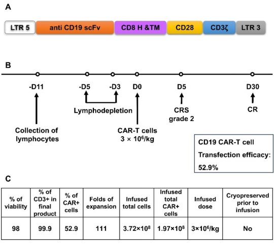 图3. CD19 CAR- T细胞的构建及CD19 CAR- T细胞输注方案。(A) CD19 CAR载体示意图。(B) CAR-T输注方案,FC用于淋巴细胞耗竭CAR-T细胞以3×106/kg的剂量输注。(C) CD19 CAR-T细胞产品质量。