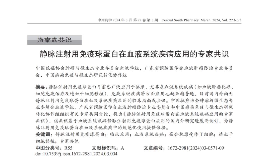 近期,由华中科技大学协和深圳医院郭智主任牵头,我司董事长史渊源教授参与,经中国抗癌协会肿瘤与微生态专业委员会血液学组、广东省预防医学会血液肿瘤防治专业委员会以及中国感染免疫与微生态研究转化协作组的专家们的深入研讨,在国家核心期刊“中南药学”上发表了题为《静脉注射用免疫球蛋白在血液系统疾病应用的专家共识》的文章。该共识基于国内外关于血液系统疾病中静脉注射用免疫球蛋白应用的研究进展而制定,旨在为规范化使用静脉注射用免疫球蛋白在血液系统疾病中给予有力依据。