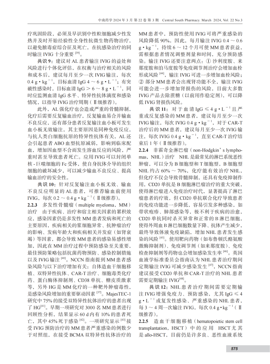 共识12:NHL 患者治疗期间需要定期输注 IVIG 增强免疫力、预防感染,尤其 IgG ≤ 4g·L - 1 或复发性感染、严重感染的 NHL 患者,每 3 ~ 4 周一次输注 IVIG,每次 0.4 g·kg - 1 (Ⅱ级推荐)。