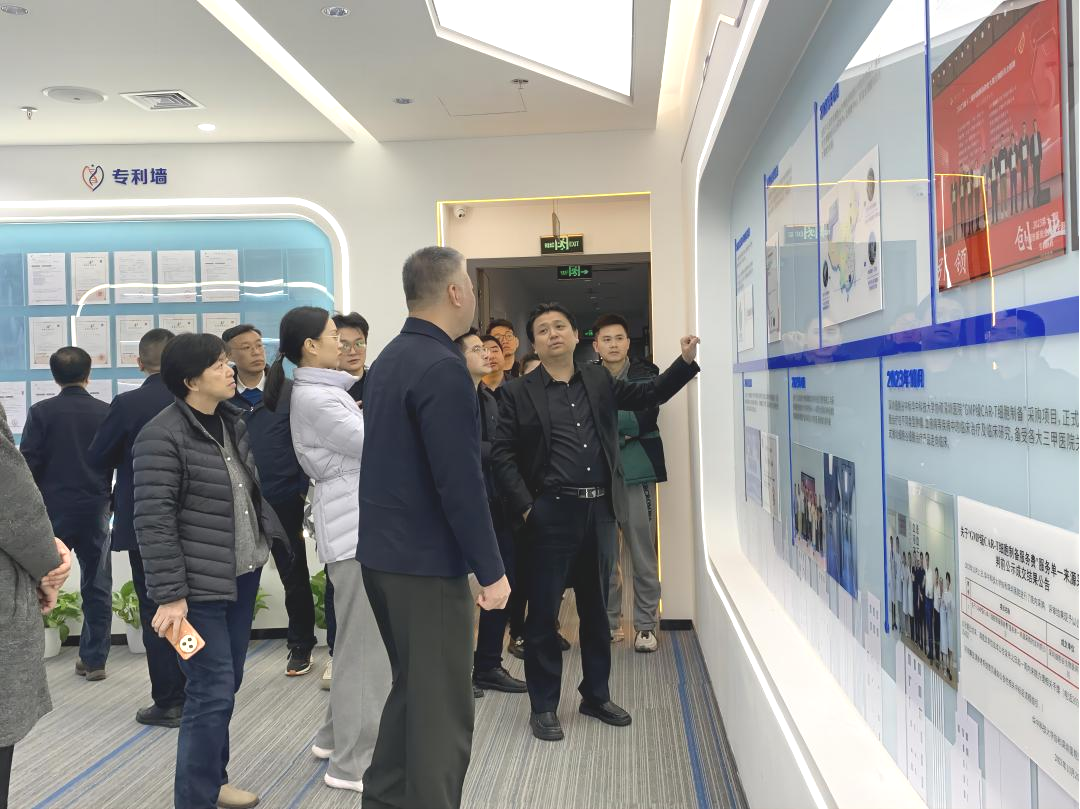 史渊源董事长陪同考察团一行参观了深圳豪门国际的智慧展厅及生产车间、研发实验室的可视化数据大屏,分析到深圳豪门国际在细胞与基因治疗平台建设、人才培育、研发赋能及临床治疗方面取得的成绩及重大突破。