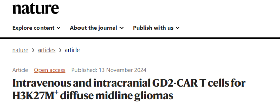 [1] Monje M, Mahdi J, Majzner R, et al. Intravenous and intracranial GD2-CAR T cells for H3K27M+ diffuse midline gliomas. Nature. 2025 Jan;637(8046):708-715. doi: 10.1038/s41586-024-08171-9. Epub 2024 Nov 13. Erratum in: Nature. 2024 Dec;636(8043):E6.
