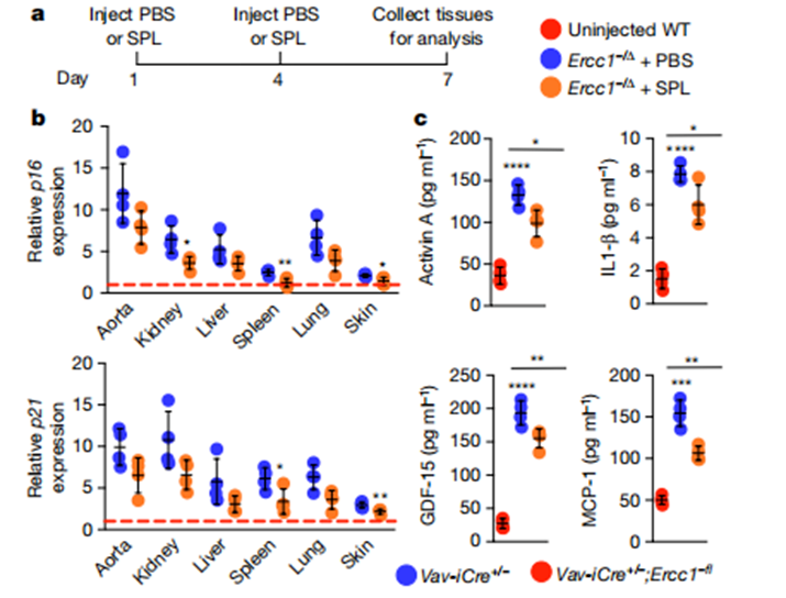 研究者采用特异性敲除ERCC-1的方法来让小鼠的免疫“未老先衰”,敲除基因后,小鼠出现了类似正常衰老小鼠的免疫特征,证明小鼠模型中免疫细胞确实出现了衰老的症状。研究者将ERCC-1敲除小鼠的免疫细胞回输给衰老小鼠,发现衰老小鼠的衰老速度变快,并且寿命也更短。
