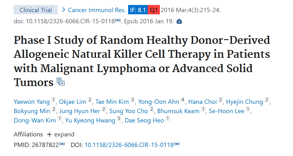 [4] Yang Y, Lim O, Kim TM, et al. Phase I Study of Random Healthy Donor-Derived Allogeneic Natural Killer Cell Therapy in Patients with Malignant Lymphoma or Advanced Solid Tumors. Cancer Immunol Res. 2016 Mar;4(3):215-24.