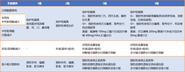 造血恢复延迟期也是CAR-T治疗后感染最常发生的时期,CRS的严重程度是唯一与感染相关的独立危险因素,因此,控制CRS至关重要,但托珠单抗的使用会使中性粒细胞减少加重,增加感染风险,所以可以在清除淋巴细胞阶段就预防性使用抗生素,减少致命感染的发生。该类患者可使用生长因子支持和输血来治疗中性粒细胞减少症、贫血和血小板减少症,长期4级中性粒细胞减少症患者应考虑使用抗菌药物预防细菌/真菌感染。如图2所示,根据中国研究型医院学会生物治疗学专委会提出的“CAR-T细胞治疗NHL毒副作用临床管理专家共识”[1],为保证治疗的顺利进行,降低骨髓抑制期感染及相关并发症,处理措施建议如下。