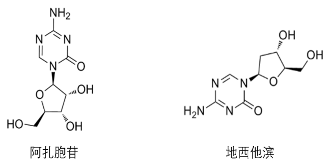 The change of DNA methylation level can promote the development of tumor, so DNA demethylation has become an important direction of tumor therapy. At present, the most commonly used treatment strategy is to develop small molecule drugs to regulate the activity of DNMT, a key DNA methylation enzyme. That is, cytosine analogues are designed for cytosine, the substrate of DNMT, which can covalently bind to DNMT, so that DNMT cannot detach from chromatin, thus inhibiting its activity. There are currently two cytosine analogues on the market, azacytidine and decitabine. Azacytidine is a pyrimidine nucleoside analogue of cytidine. After cellular uptake and enzymatic bioconversion to triphosphate nucleotide, azacytidine is incorporated into DNA and RNA to slow down the disease process by inhibiting DNA/RNA methyltransferase, DNA synthesis and cell proliferation. Azacytidine is mainly used as an antitumor drug, and is clinically used in the treatment of breast cancer, bowel cancer and melanoma. It is indicated for adults with acute myeloid leukemia who have a first complete response (CR) after intensive induction chemotherapy or a first complete response but whose blood count has not fully recovered (CRi) and cannot continue to complete intensive therapy. Decitabine, a natural adenosine analogue of 2 '-deoxycytidylate, reduces DNA methylation by inhibiting DNA methyltransferase, thereby inhibiting tumor cell proliferation and preventing the development of drug resistance. Decitabine is the strongest known specific inhibitor of DNA methylation and belongs to the S-phase cell cycle specific drug. Applicable to patients with intermediate-risk 1, intermediate-risk 2, and high-risk primary and retreated myelodysplastic syndromes (MDS), including primary and secondary MDS, according to FAB subtypes: Refractory anemia, refractory anemia with ring siderocytosis, refractory anemia with protocytosis, refractory anemia with protocytosis - transformation, chronic granulomonocytic leukemia.