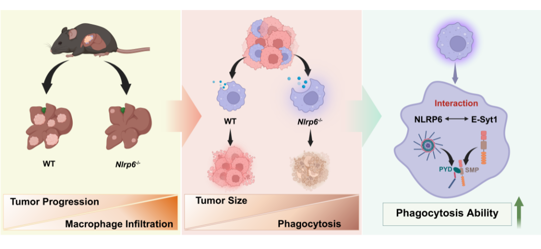 首次发现NLRP6顺利获得其PYD结构域与内吞关键蛋白E-Syt1的SMP结构域结合,形成负反馈调控环路,显著增强巨噬细胞对肿瘤细胞的吞噬能力。