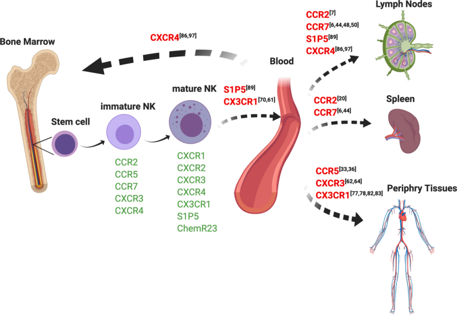 Cytokine and Growth Factor Reviews上发表了一篇综述“Chemokine networks modulating natural killer cell trafficking to solid tumors”,文章中介绍了与NK细胞相关的趋化因子受体,包括CCR2、CCR5、CCR7、CXCR3和CX3CR1,以及改善NK细胞瘤内浸润的策略。简单介绍这篇综述的主要内容如下: